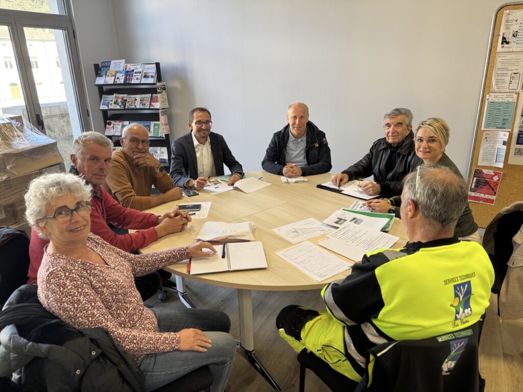 Une réunion en présence de Michel Eschalier, conseiller municipal, Nicolas Combe, agent communal – chef d’équipe « voirie » – ainsi que Patricia Faure et Philippe Etienne de l’Office Municipal des Sports.